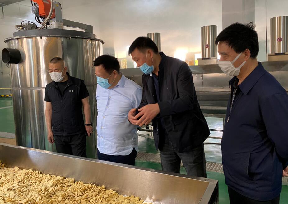 金輝同志先后查看了新建醬車間施工現(xiàn)場(chǎng)、鍋巴生產(chǎn)線試運(yùn)行現(xiàn)場(chǎng),詳細(xì)了解了工程推進(jìn)情況和產(chǎn)品工藝流程,并對(duì)安全生產(chǎn)和疫情防控工作提出了要求。隨后,聽取了企業(yè)負(fù)責(zé)人王新武等同志關(guān)于當(dāng)前經(jīng)濟(jì)運(yùn)行情況和市場(chǎng)分析研判的工作匯報(bào),就下一步工作思路和當(dāng)前需要解決的問題進(jìn)行了交流研討。